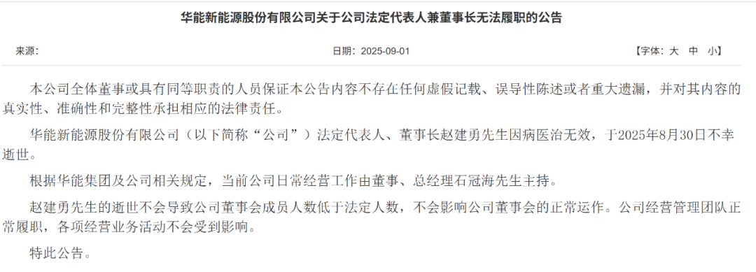 9月1日,华能新能源股份有限公司发布关于公司法定代表人兼董事长无法履职的公告称,公司法人、董事长赵建勇因病医治无效,于2025年8月30日不幸逝世。